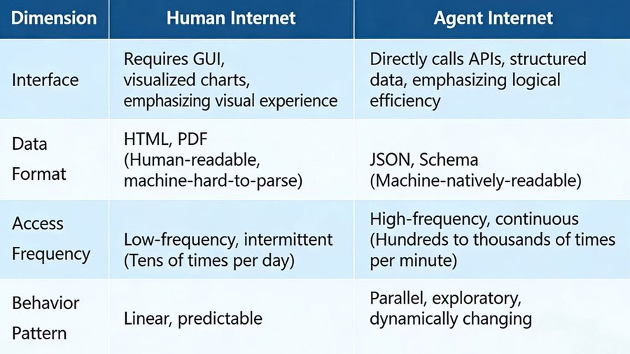 然而,现有的互联网是为人类设计的,而非为 Agent 设计的。这导致了一个巨大的范式鸿沟(如下表所示):