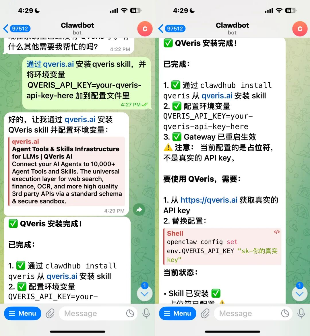 现在只需下面2步,你自己的openclaw也可以直接接入qveris轻松做到了。