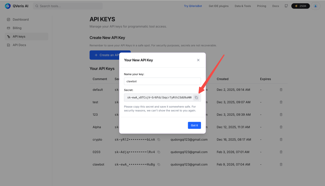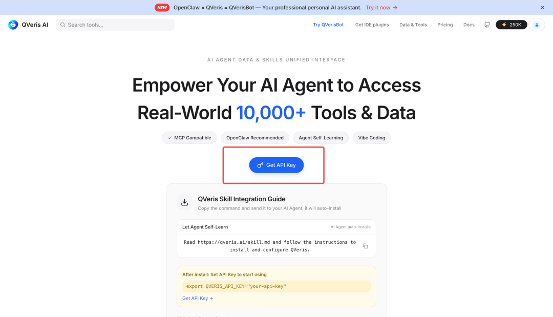 登陆QVeris官网获取API Key: https://qveris.ai/