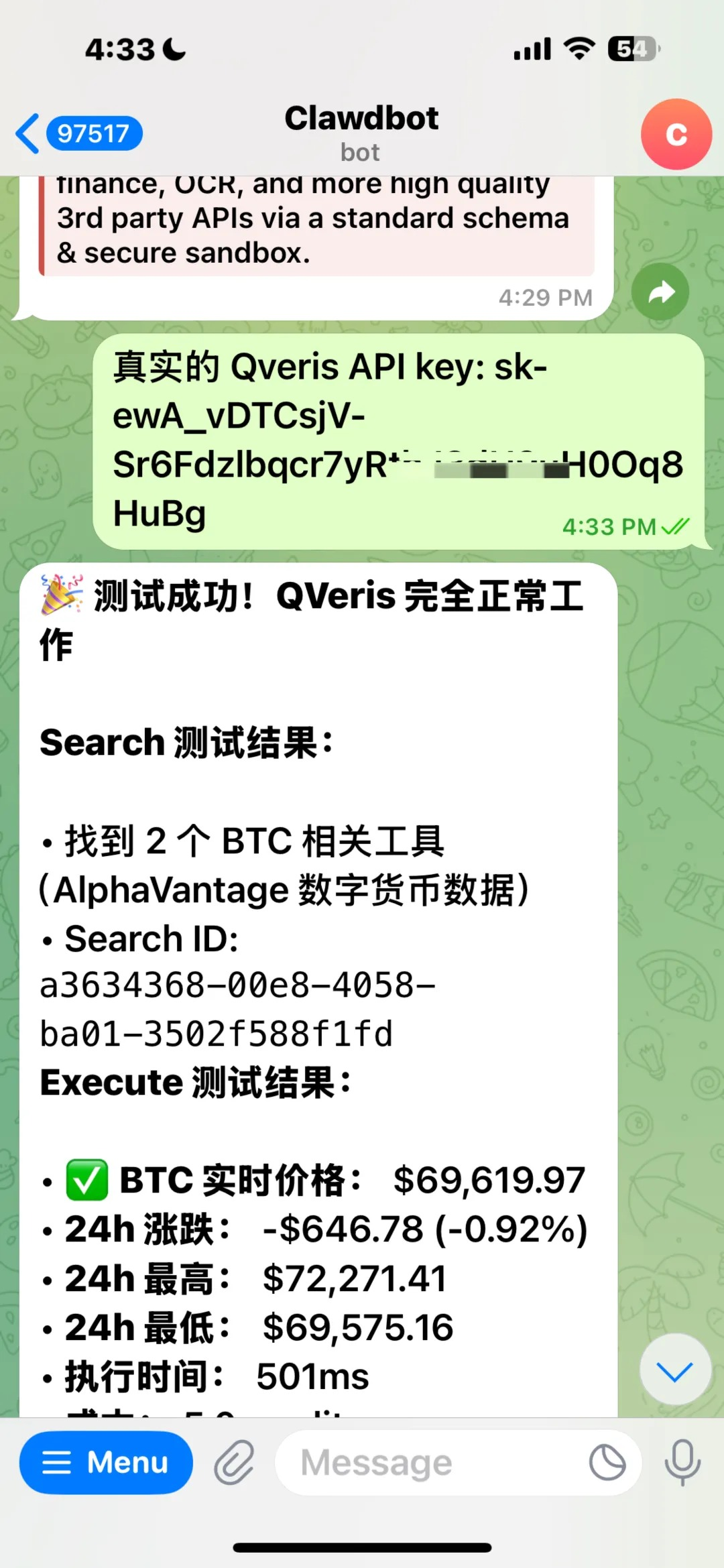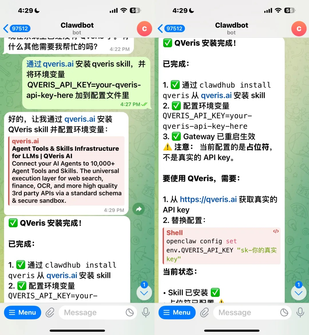 无论是在飞书、Telegram 等平台使用 OpenClaw,配置逻辑完全一致。指令执行完成后,你会收到 “QVeris 安装完成” 的明确提示,这就意味着你已实现 openclaw 金融数据的接入!
