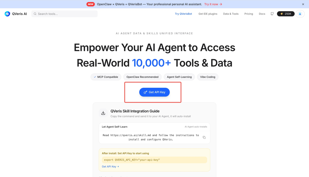 打开 QVeris 官方网站:https://qveris.ai/;在首页显著位置点击Get API Key按钮;