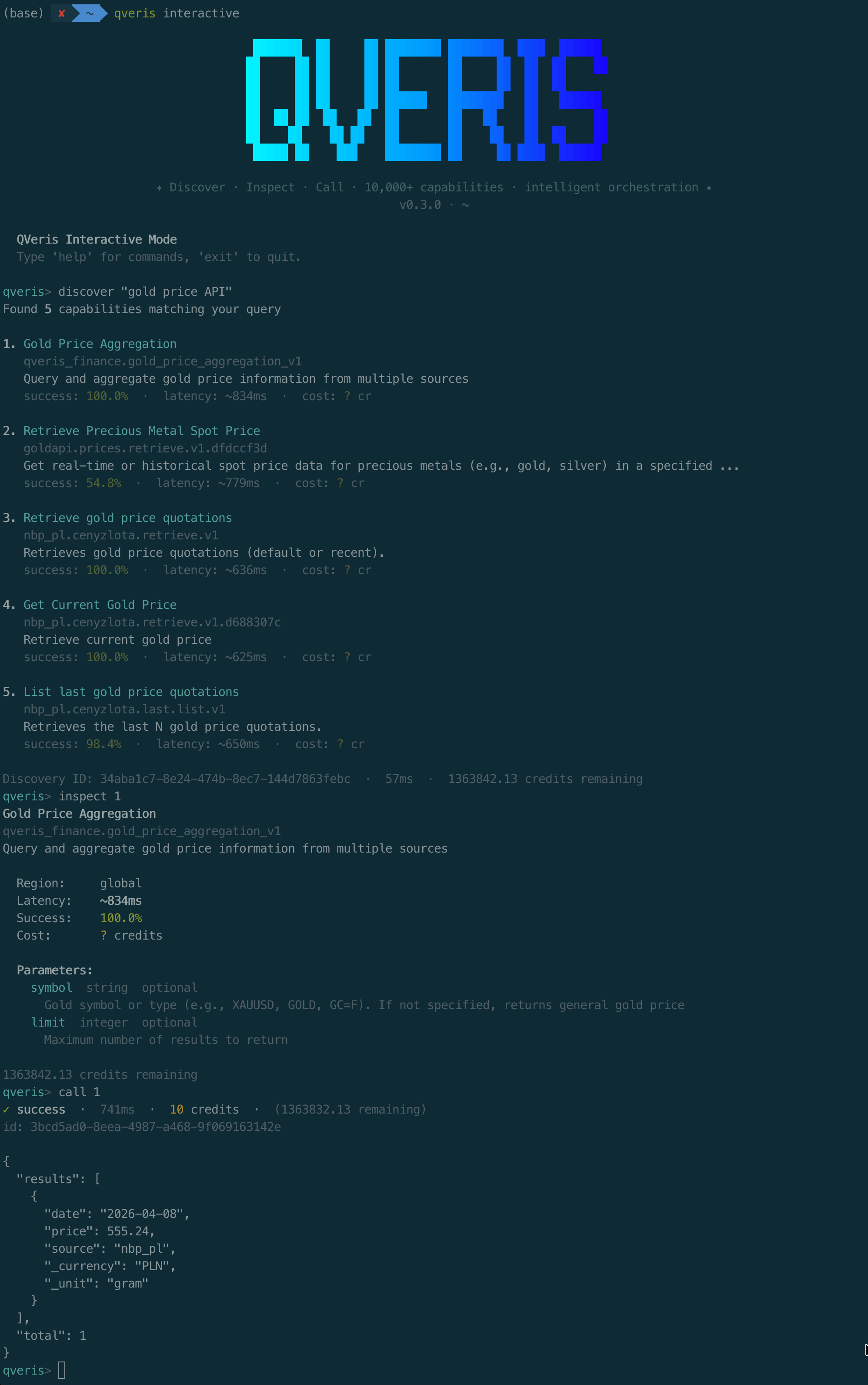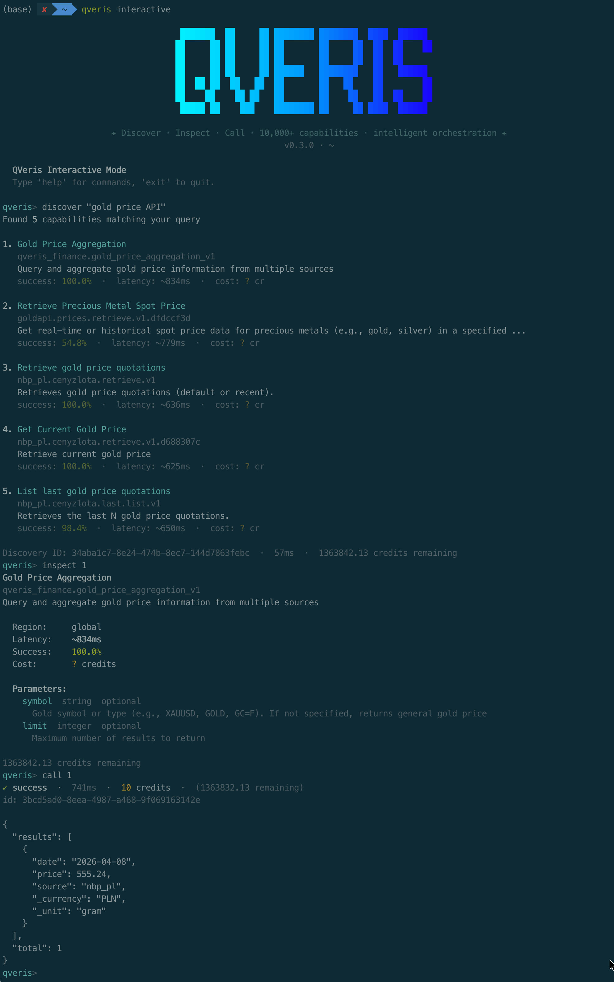 > 💬 **交互式 REPL**`qveris interactive` 启动探索环境,像对话一样发现和试用 API。