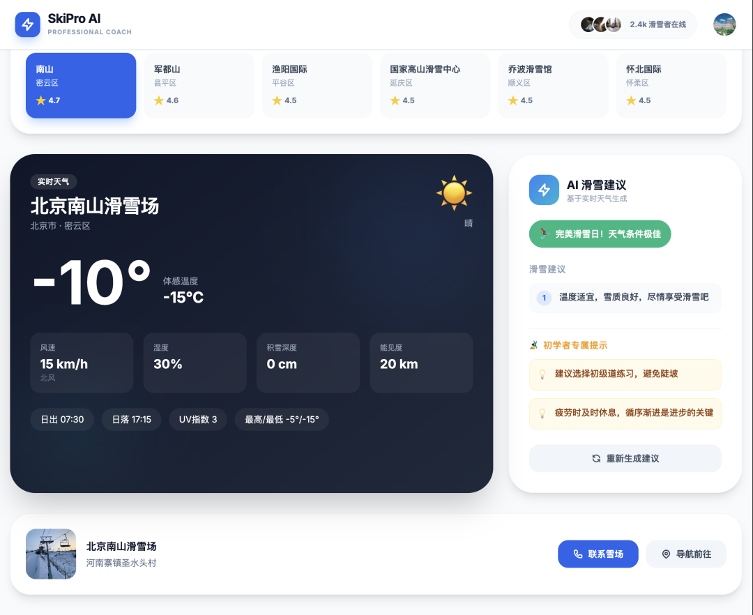 - ❄️ 雪场实时天气、雪质分析、行前装备建议