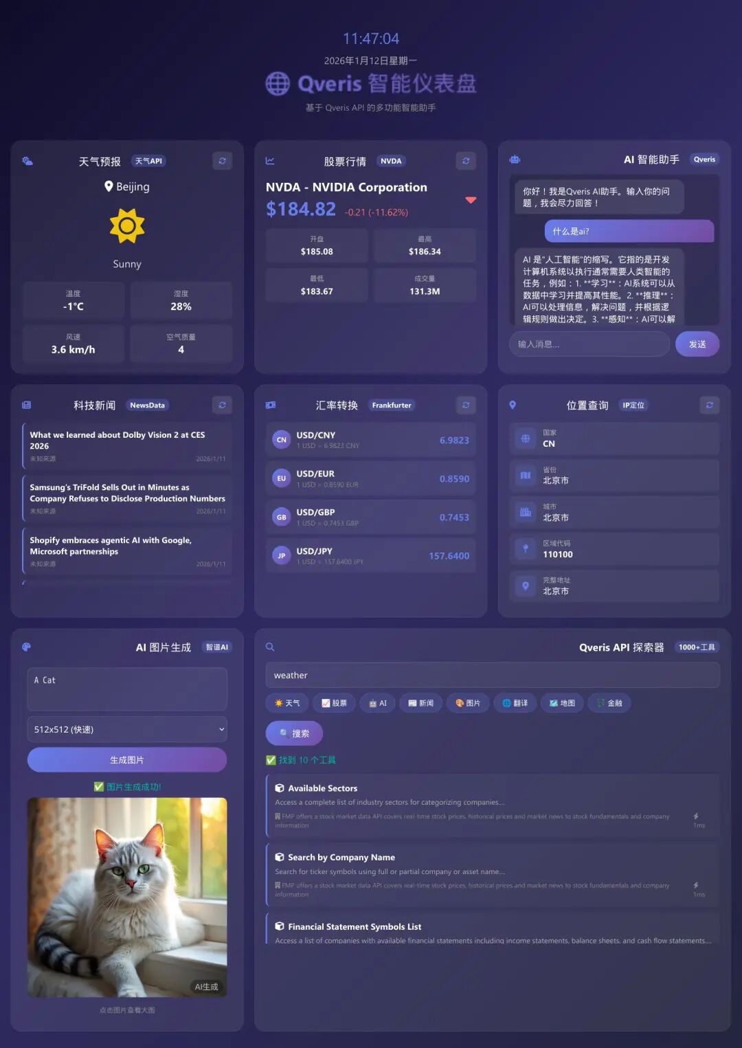 项目以现代化玻璃拟态仪表盘为载体,通过 Qveris 统一工具调用接口,在一个页面内跑通了十多类真实能力,包括: